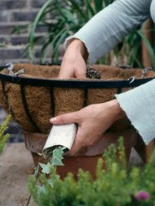 Las macetas colgantes han sido la atracción de la primavera. Sin embargo ahora ha estado como tendencia de jardinería el colocar una capa de Fibra de coco entre la estructura de hierro y las plantas de interior o de exterior. Para que no se desperdicie la tierra con el riego, utiliza sobre la fibra un diaper / pañal desechable nuevo; éste retendrá la humedad. Mira las ilustraciones siguientes y paso a paso logra una combinación perfecta de tus favoritas plantas de estación, anuales o perennes con este proyecto DIY.